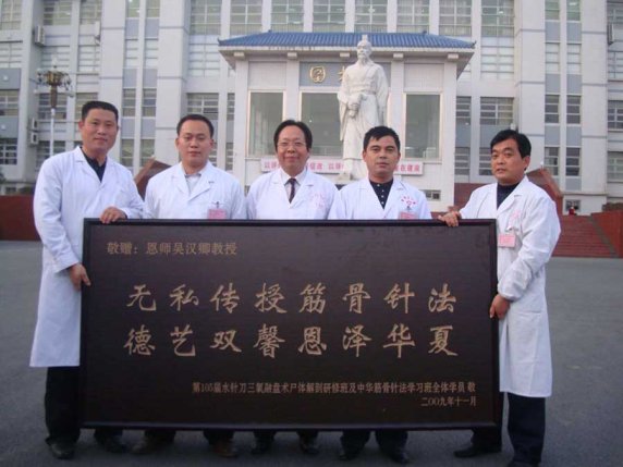 • 全国第108届水针刀法及中华筋骨针法研修班全体学员赠匾留念全国第108届水针刀法及中华筋骨针